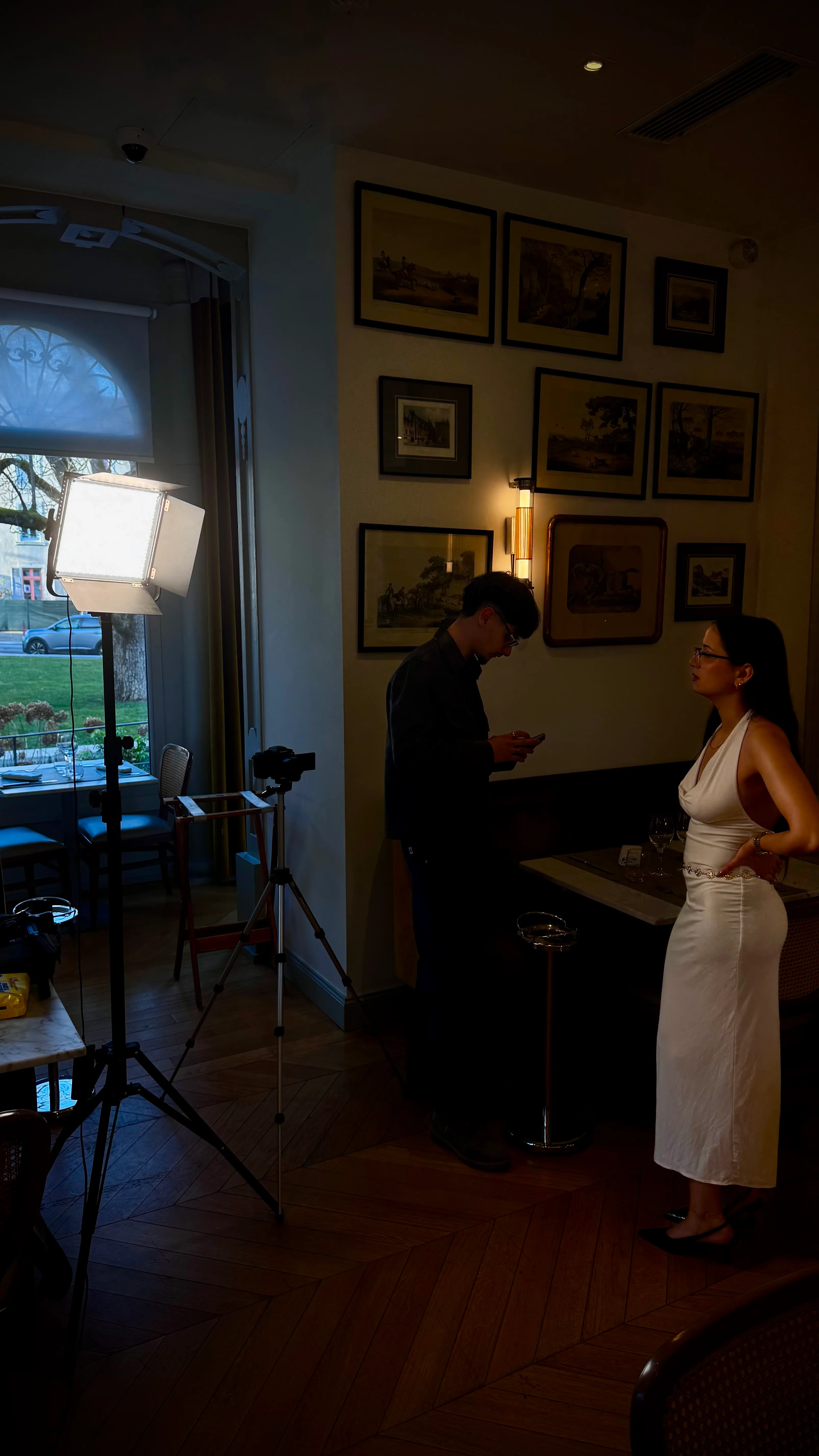 Tournage d'un clip dans l'intimité d'un hôtel. Lumière dorée, rideaux lourds, marbre froid.